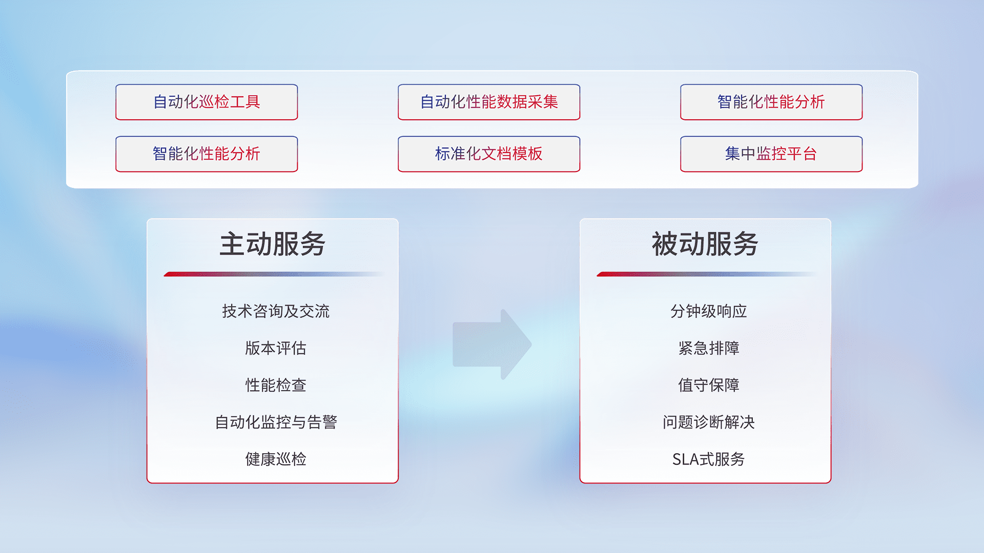 智能化工具和标准化文档,,,,保障服务质量,,,,提供主动服务(包含技术咨询、、版本评估、、、性能检查、、自动化监控与告警、、、、健康巡检)和被动服务包含(分钟级响应、、、紧急排障、、、值守保障、、、问题诊断解决、、、、SLA服务)。。