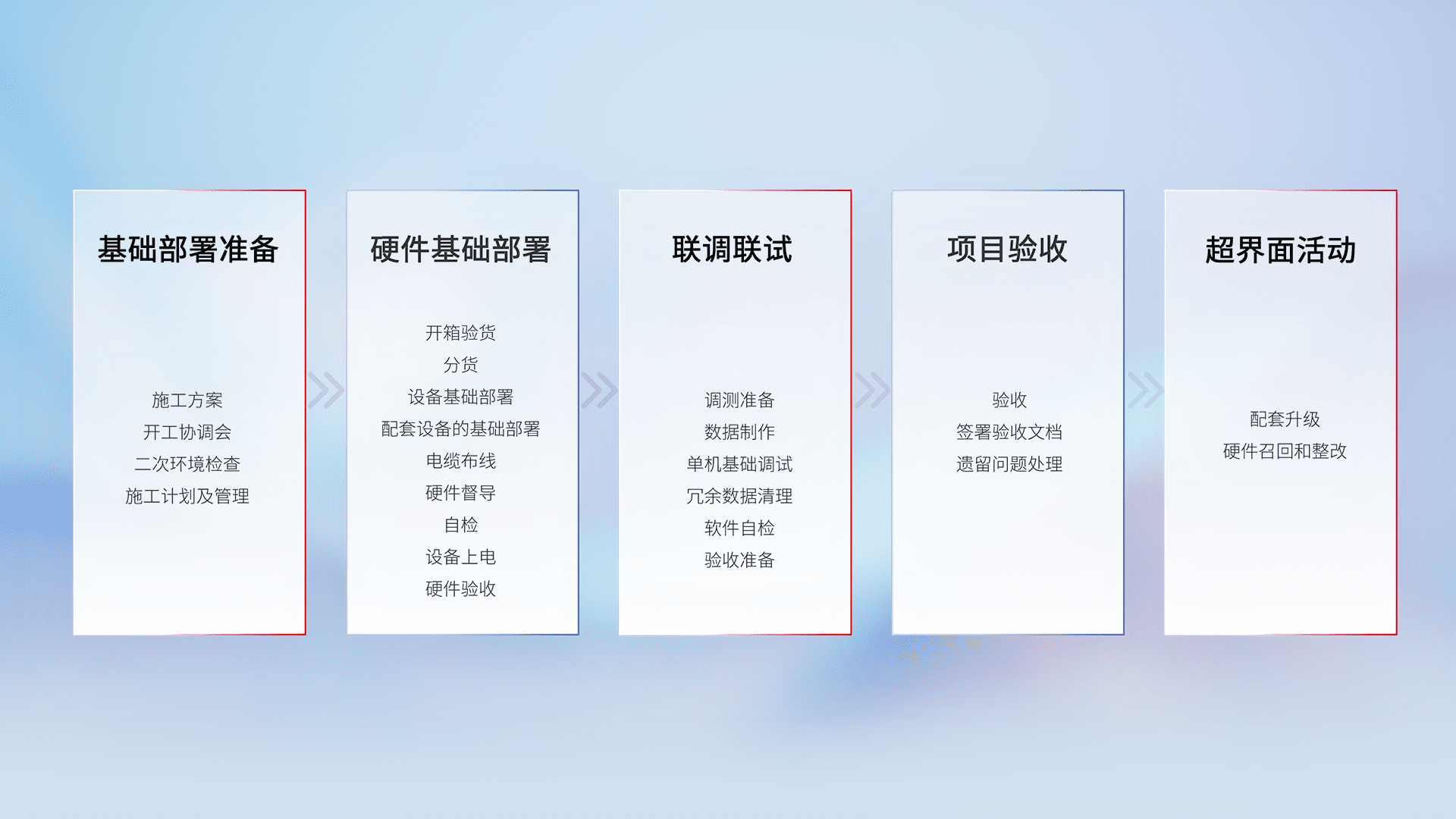 从基础部署准备、、硬件基础部署、、、、联调联试、、、、项目验收、、越界面活动的全过程可追溯,,,,保证施工质量和进度。。。。